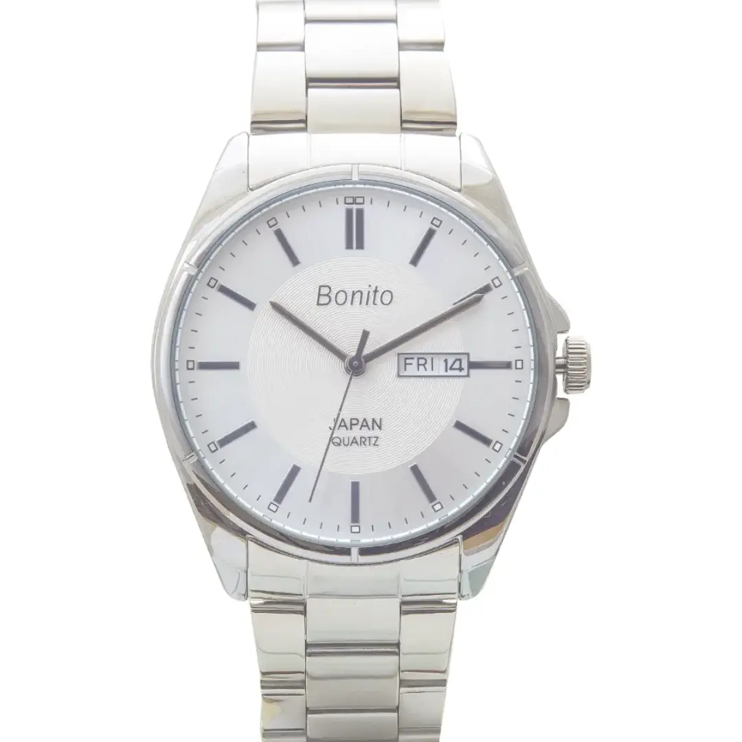 Bonito Metal Band Men Watch. The case is made out of silver stainless steel with a silver bezel, which stands for the high quality of the item, it has a white color dial. This model has got 30 meters of water resistance. it can be worn in scenarios where it is likely to be splashed but not immersed in water and will be fine in rain. The watch is shipped with an original box and a guarantee from the manufacturer.